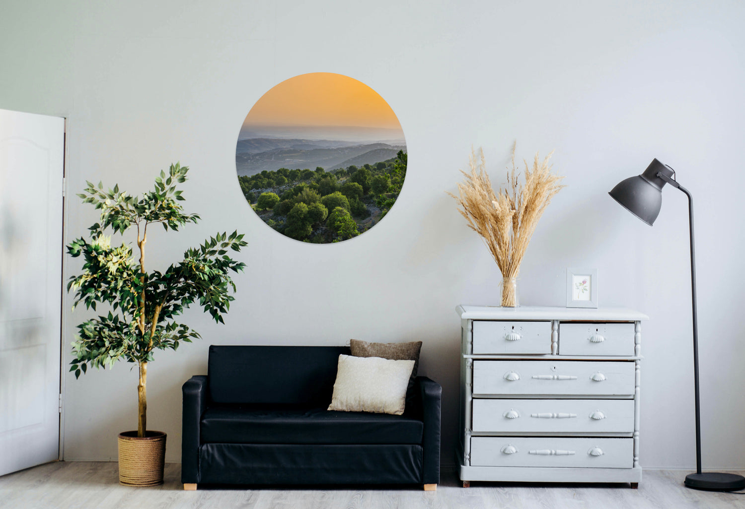 Rooms are filled with rectangles. Break the pattern with a circular art piece.