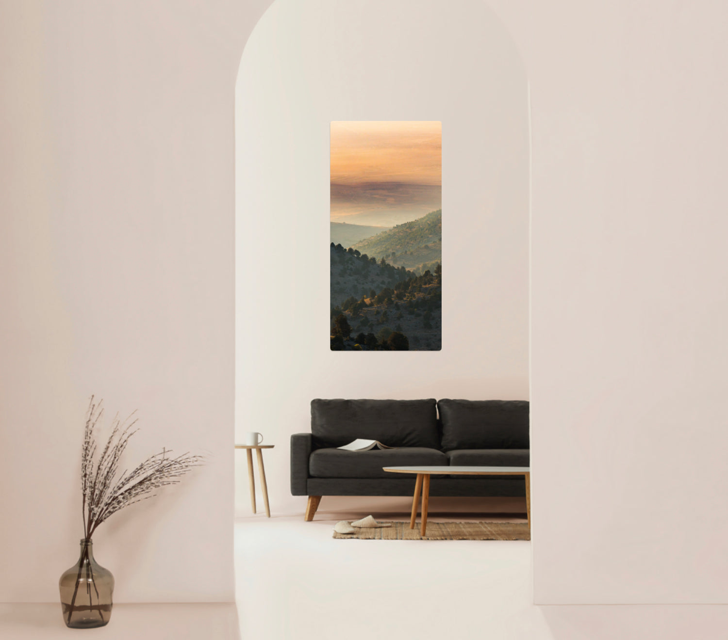 Fill empty column walls with tall prints of mountains.